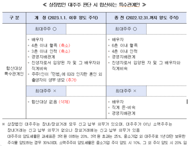 ① 최대주주인 경우 : 본인과 기타 주주(4촌 이내 혈족, 3촌 이내 인척, 배우자, 친생자로서 입양된 자 및 그 배우자와 직계비속, 경영지배관계 법인, 주주 1인이 '민법'에 따라 인지한 혼인 외 출생자의 생부나 생모)의 지분을 합산해 판단