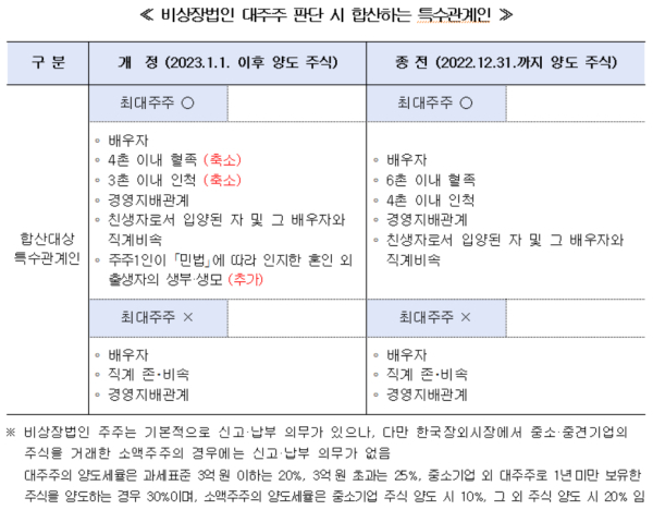 ① 최대주주인 경우 : 본인과 기타주주(4촌 이내 혈족, 3촌 이내 인척, 배우자, 친생자로서 입양된 자 및 그 배우자와 직계비속, 경영지배관계 법인, 주주 1인이 '민법'에 따라 인지한 혼인 외 출생자의 생부나 생모)의 지분을 합산해 판단