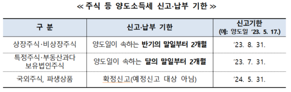- 해당 주식이 특정주식 및 부동산과다보유법인주식 등 기타 자산에 해당하는 경우 양도일이 속하는 달의 말일부터 2개월까지 신고해야 한다.