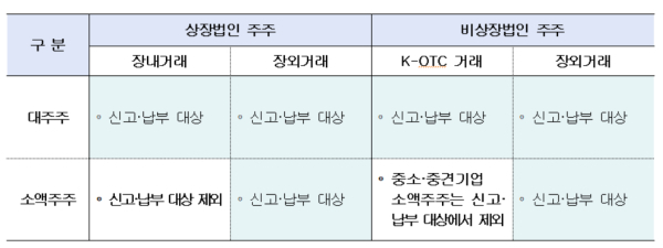 ①상장법인 대주주(장내·장외 거래 불문) ②상장법인 소액주주(장외거래) ③비상장법인 주주(한국장외시장을 통해 양도한 중소·중견기업 소액주주 제외)가 보유하던 주식을 양도하는 경우 과세 대상에 해당합니다.