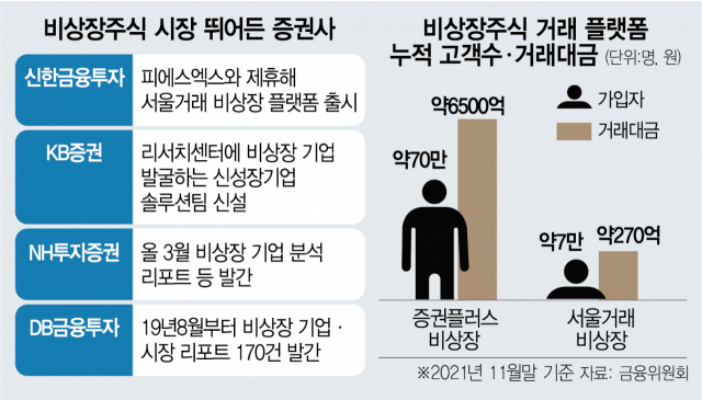 그래서 기존 증권사들도 비상장주식 전담 조직, 분석 보고서 작성 등 비상장주식 시장에 눈독 들이고 있습니다. DB금융투자는 비상장 기업 담당 애널리스트 3명을 투입해 분석리포트 내놓고 있고, NH투자증권은 비상장 기업을 전문적으로 분석할 수 있는 벤처캐피털(VC) 심사역 출신 애널리스트를 영입했습니다. KB증권은 전문연구 6명으로 신성장기업솔루션팀을 만들어 비상장 기업 리포트 ‘케비어(케이비 비상장 어벤져스)’를 내놓고 있습니다.